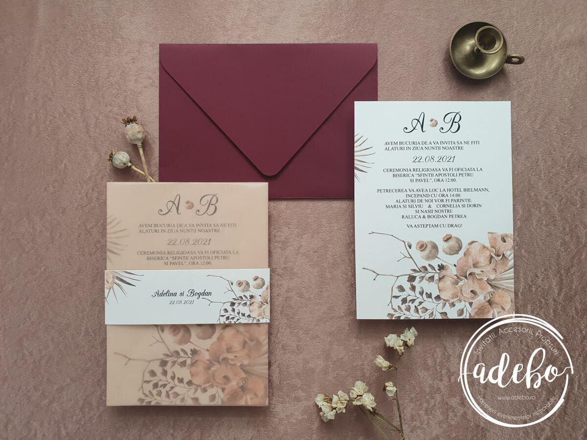 Realizam o gama variata de invitatii de nunta handmade cat si invitatii de botez personalizate conform cerintelor clientului, seturi de papetarie: meniu, numar masa, plic bani, etichete marturii, propsuri photobooth. Punem foarte mare accent pe detalii si calitatea produsului final livrat catre client, astfel incat nu trebuie sa va faceti griji in aceasta privinta.